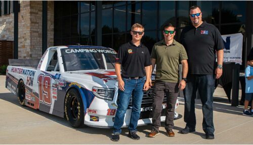 Things got loud in Grapevine, TX, this past Thursday as the #19 NASCAR Camping World Series Truck rolled onto the parking lot of Texas Gun Experience. NASCAR driver Derek Kraus met with fans and signed autographs, with the #19 Hunter Nation Toyota Tundra and MHR hauler on display. Kraus took time to explain to Hunter…